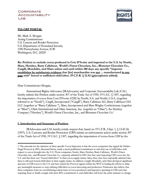 Corporate Accountability, International Rights Advocates, and the UC Irvine Civil Rights Litigation Clinic submitted a petition under Section 307 of the Tariff Act of 1930 to U.S. Customs and Border Patrol (CBP). Section 307 prohibits the importation of all goods produced in whole or in part with forced or prison labor. The petition includes evidence of forced child labor in the Ivorian cocoa industry and requests that CBP issue a conditional Withhold and Release Order (WRO) against major cocoa importers, giving these companies 180 days to demonstrate significant changes to address their role in benefitting from forced child labor in the cocoa sector of Cote D’Ivoire.